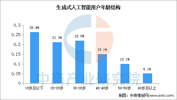 從年齡結(jié)構(gòu)看,生成式人工智能的主要群體為年輕用戶,但已開始向中高齡群體滲透。19歲及以下用戶占比最高,達(dá)26.4%;20-29歲用戶占比為21.3%;30-39歲用戶占比為22.0%;40歲以上用戶占比合計30.3%,半年提高4.9個百分點。