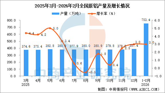 2026年1-2月全國原鋁產(chǎn)量增長情況