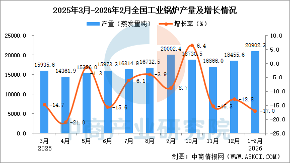 中商情報(bào)網(wǎng)訊:據(jù)中商產(chǎn)業(yè)研究院數(shù)據(jù)庫(kù),2026年1-2月全國(guó)工業(yè)鍋爐當(dāng)月產(chǎn)量與去年同期相比下降。2026年1-2月全國(guó)工業(yè)鍋爐產(chǎn)量為20902.3蒸發(fā)量噸,同比下降17.0%。
