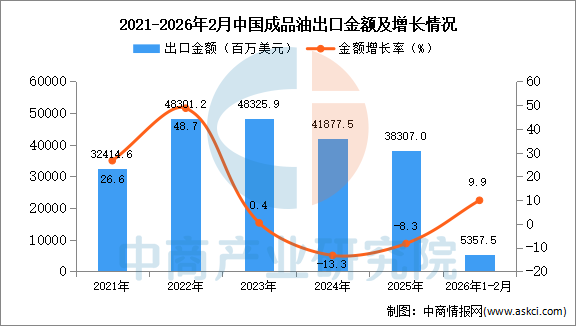2026年2月中國(guó)成品油出口量及金額增長(zhǎng)情況