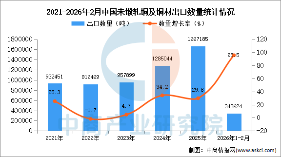 2026年1-2月中國(guó)未鍛軋銅及銅材出口數(shù)據(jù)統(tǒng)計(jì)分析:出口量同比增長(zhǎng)95.5%