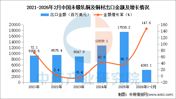 從金額方面來(lái)看,數(shù)據(jù)顯示,2026年1-2月中國(guó)未鍛軋銅及銅材出口金額4383.1百萬(wàn)美元,同比增長(zhǎng)147.6%。