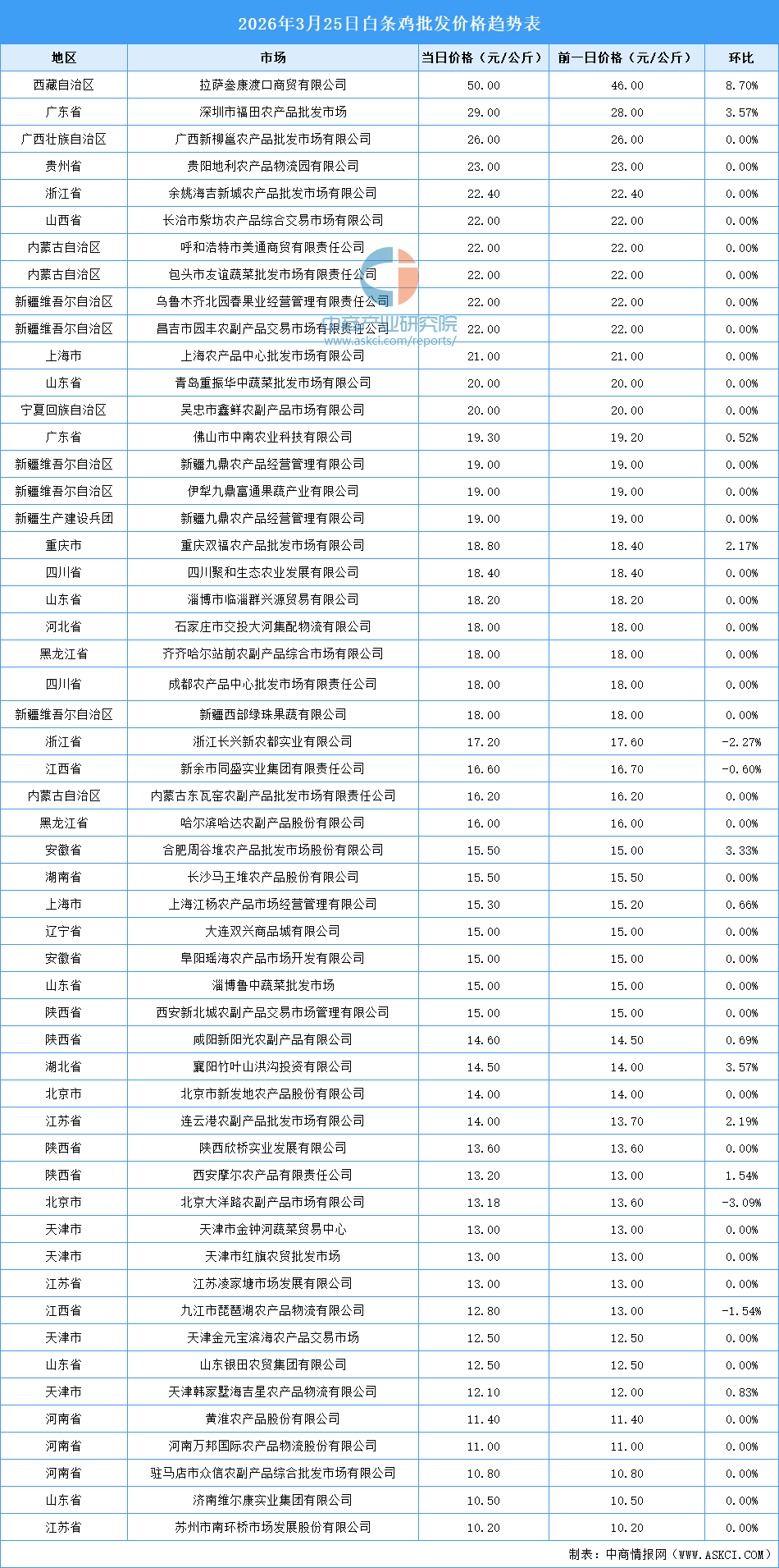 中商情報(bào)網(wǎng)訊:最新數(shù)據(jù)顯示:3月25日全國(guó)白條雞平均價(jià)格為17.36元/公斤。其中,白條雞價(jià)格最高的市場(chǎng)是拉薩叁康渡口商貿(mào)有限公司,當(dāng)日價(jià)格為50.00元/公斤,環(huán)比上漲8.70%。白條雞價(jià)格最低的市場(chǎng)是蘇州市南環(huán)橋市場(chǎng)發(fā)展股份有限公司,當(dāng)日價(jià)格為10.20元/公斤,環(huán)比持平。